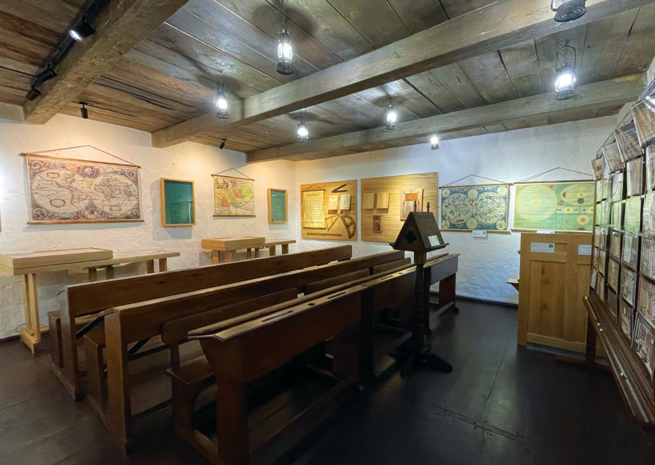 Дві головні зали музею, Шкільний клас та Кімната вчителя, знайомлять відвідувачів як з особливостями навчального процесу минувшини, так і з побутом звичайного сільського вчителя-ентузіаста, який живе своєю справою, та навіть колекціонує цінні артефакти з історії освіти різних країн. А родзинкою експозиції стали скрипторії – спеціальні письмові столи, за якими переписувалися та оздоблювалися книги в Середні віки, з повним набором інструментів для створення рукописів.