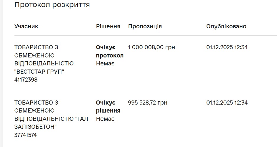 Зрештою, на трираундовий англійський аукціон вийшли лише два учасники: ТОВ «Захід-метал» та ТОВ «Вестстар груп». Обидві компанії запропонували ціну, вищу за початкову лише на мінімальний крок, і жодного разу не підвищили свої пропозиції у наступних раундах, що є ознакою змови.