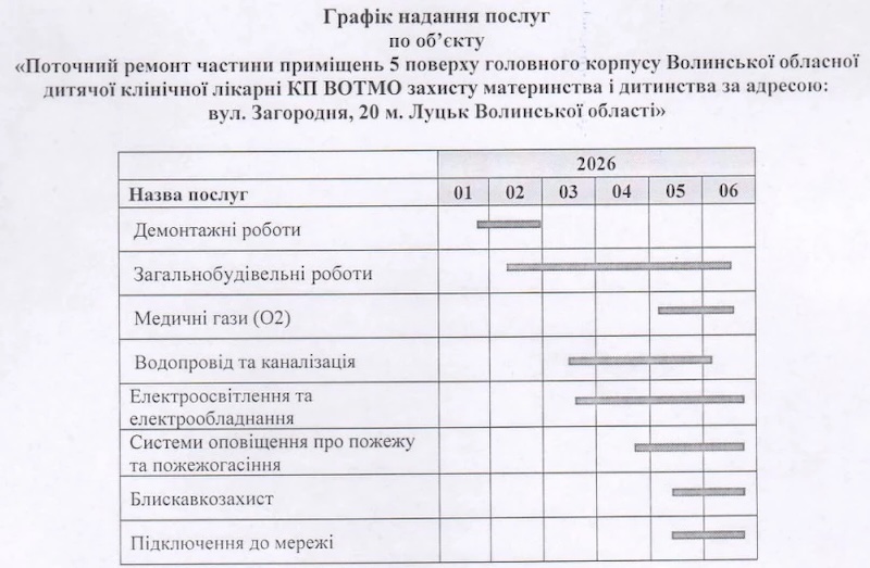 За договором, до кінця лютого виконавець має провести демонтажні роботи: зняти двері, почистити дверні та віконні відкоси, також зняти покриття з підлоги, плитку на стінах, обшивку стель, а також сантехніку. Одночасно триватимуть загальнобудівельні роботи. Зокрема, підрядник має зробити систему медичного газопостачання, замінити трубопроводи для водопостачання й каналізації, оновити систему електропостачання й зробити блискавкозахист.