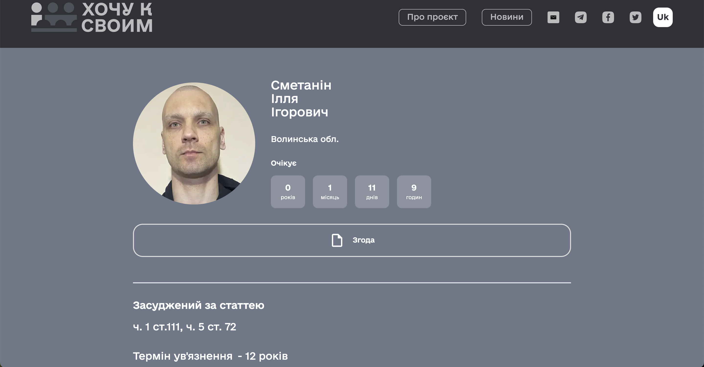 Про це відомо із сайту державного проєкту «Хочу к своим». Сметанін вже очількує місяць та 11 днів.