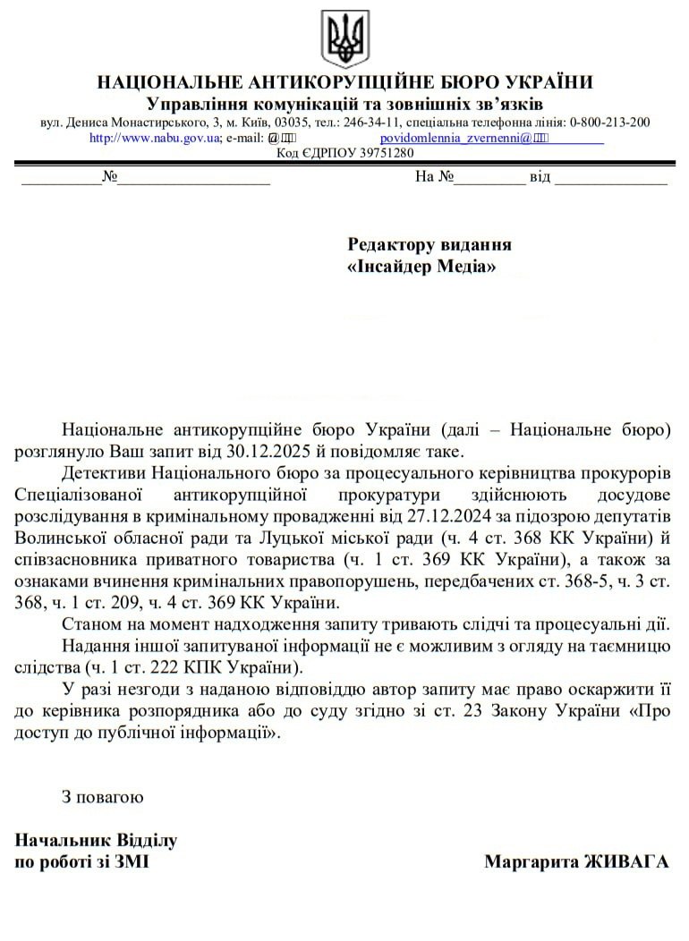 Зазначають, що детективи Національного бюро за процесуального керівництва прокурорів Спеціалізованої антикорупційної прокуратури здійснюють досудове розслідування в кримінальному провадженні від 27.12.2024 за підозрою депутатів Волинської обласної ради та Луцької міської ради (ч. 4 ст. 368 КК України) й співзасновника приватного товариства (ч. 1 ст. 369 КК України), а також за ознаками вчинення кримінальних правопорушень, передбачених ст. 368-5, ч. 3 ст. 368, ч. 1 ст. 209, ч. 4 ст. 369 КК України.