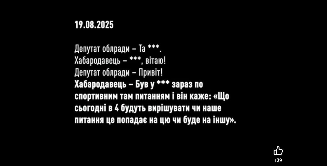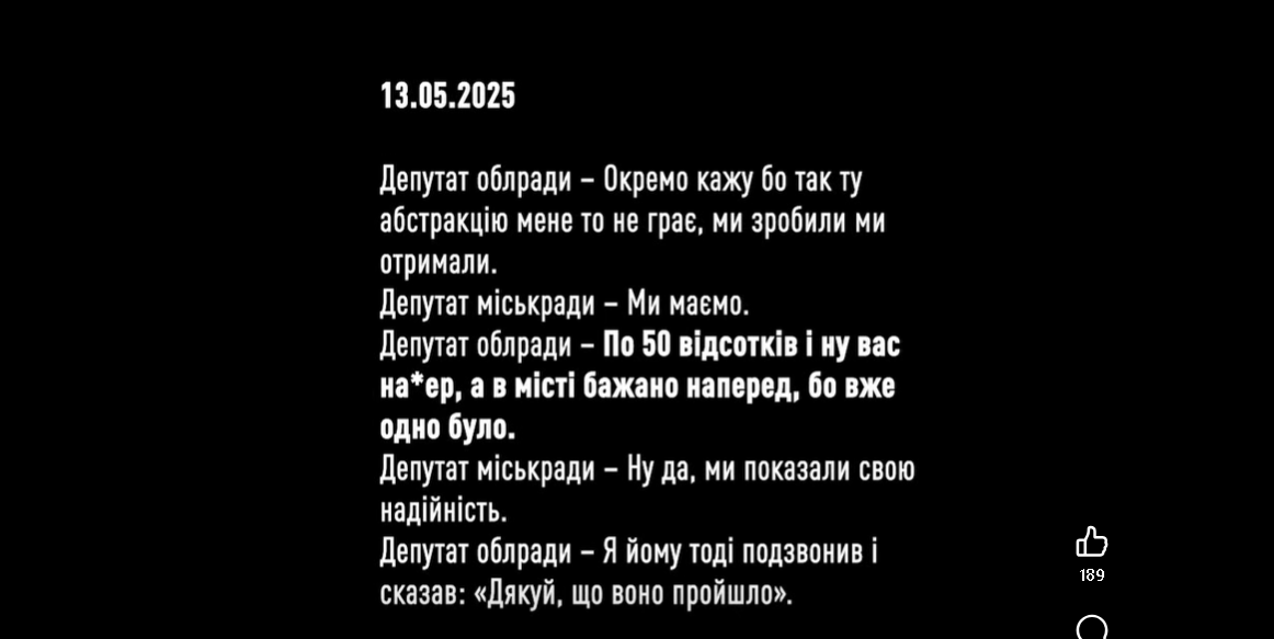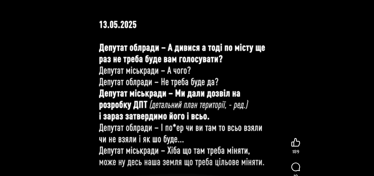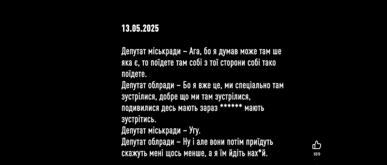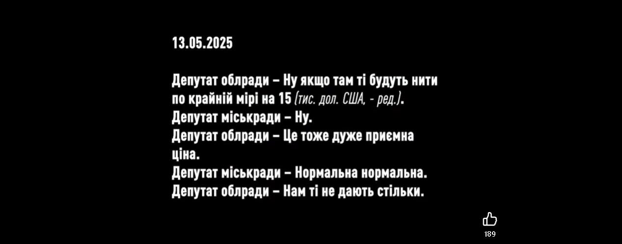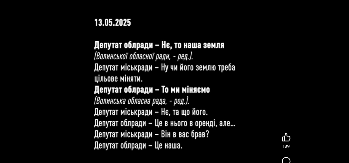 "Депутат Волинської обласної ради повідомляє орендарю земельної ділянки, який погодився надати хабар про позитивне голосування Луцькою міською радою за надання дозволу на розроблення проекту детального плану території. Депутат акцентує увагу, що голосування пройшло в притик, тобто без участі депутатів його фракції, результату не було б".