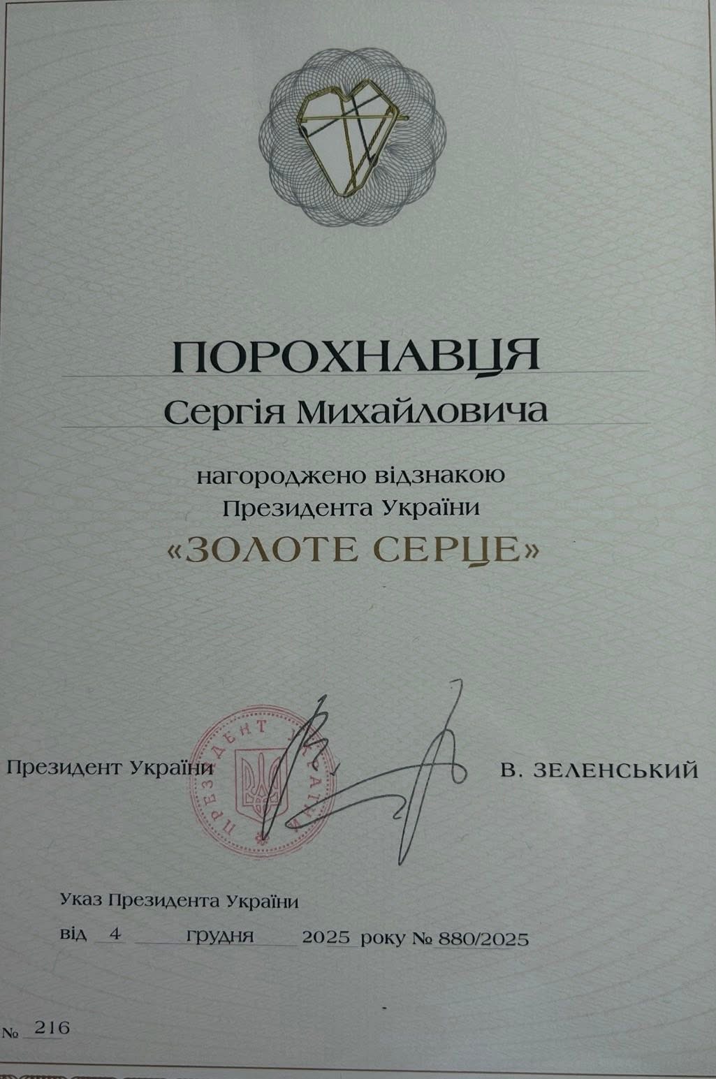 У Ковелі волонтер Сергій Порохнавець отримав державну нагороду України «Золоте Серце», засновану Президентом у 2022 році.