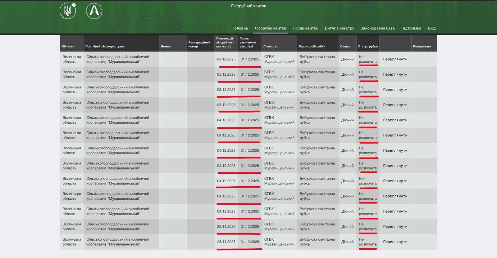 Крім того, з відкритих джерел встановлено, що на відповідний квартал та виділ, у межах яких здійснювалась порубка, був виданий лісорубний квиток, термін дії якого закінчився 31.12.2025 року, при цьому статус рубки – «не розпочата», що підтверджує незаконність вищезазначеної порубки.