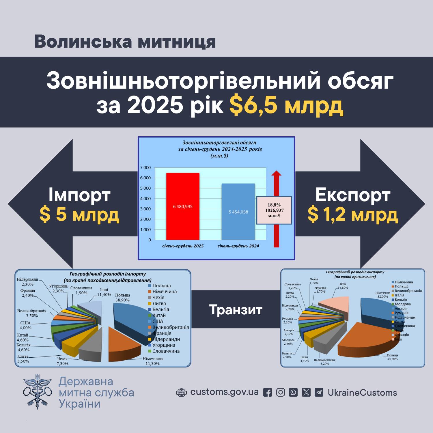 Також інфраструктурою митниці час від часу користувалось 2656 суб’єктів господарювання, які акредитовані в інших регіонах України. Разом у 2025 році вони наростили обсяги зовнішньоторговельних операцій на 19% і досягнули суми у 6 млрд 481 млн дол. США, - інформують на сторінці Волинської митниці.