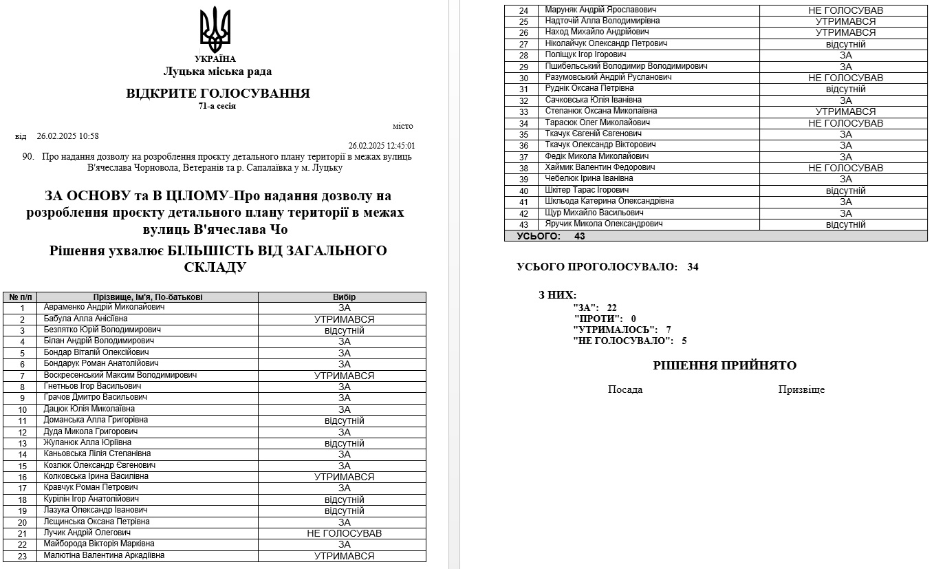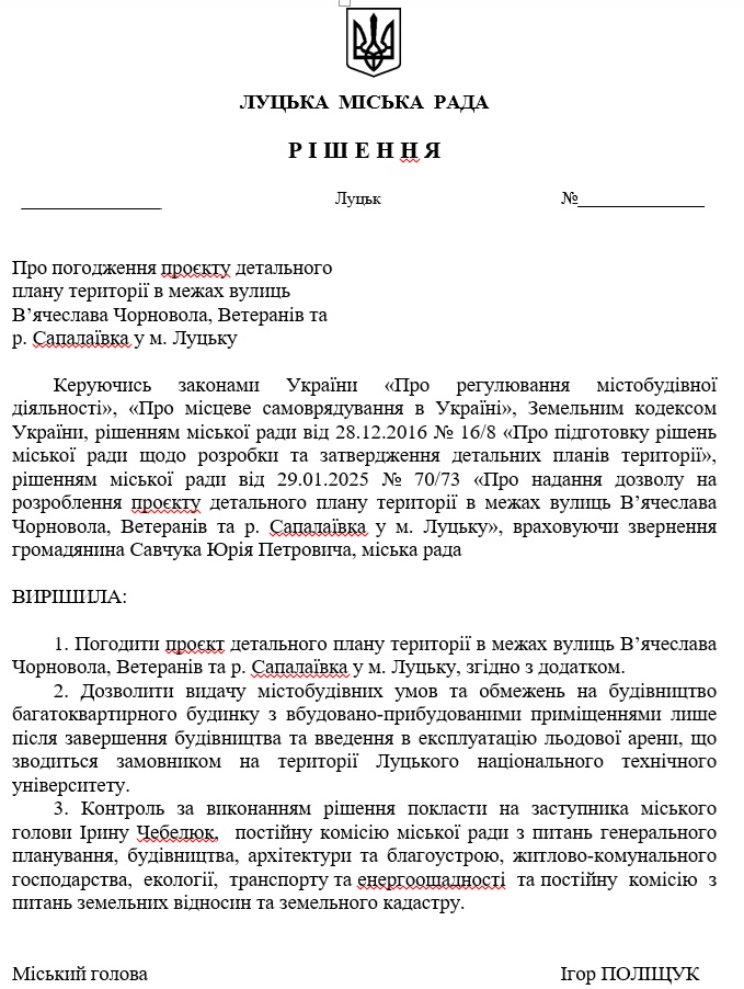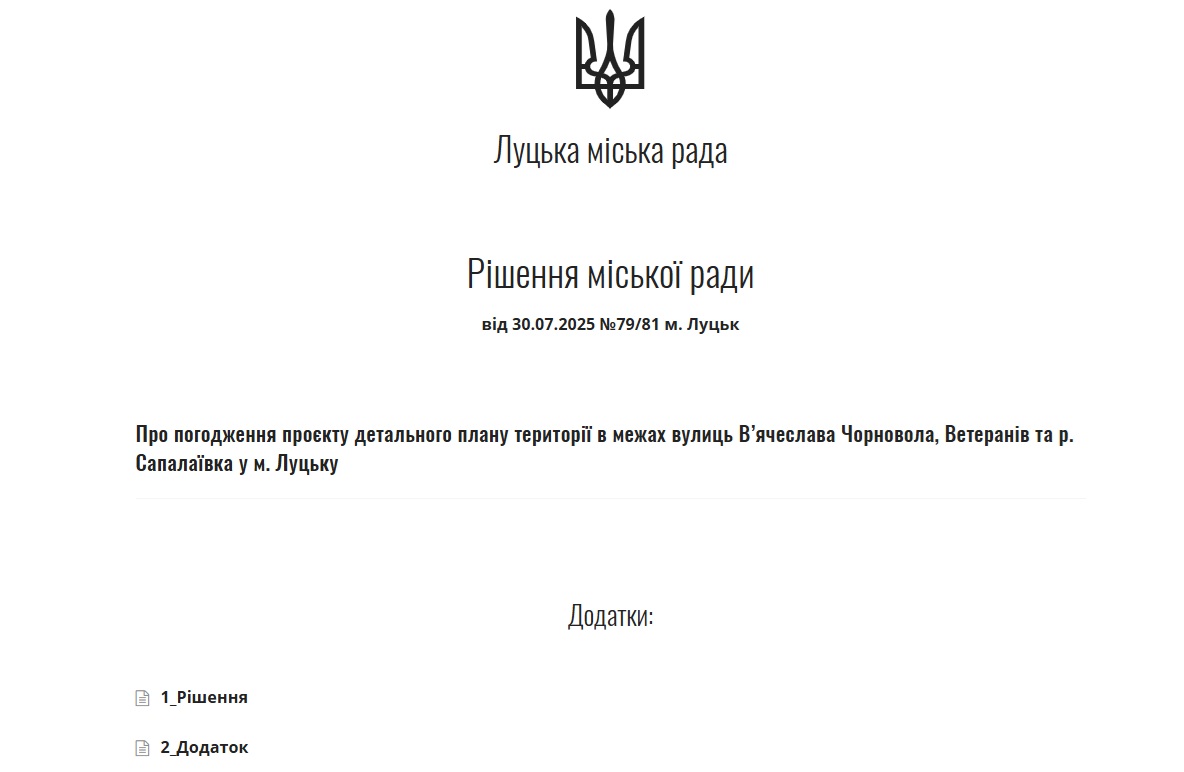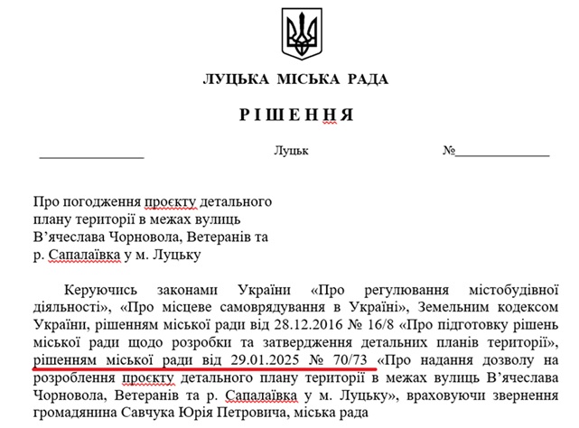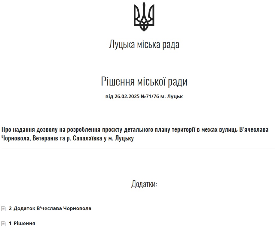 Так, 26 лютого 2025 року під час сесії депутати ухвалюють «Про надання дозволу на розроблення проєкту детального плану території в межах вулиць В’ячеслава Чорновола, Ветеранів та р. Сапалаївка у м. Луцьку».