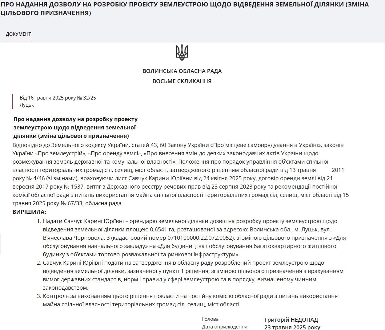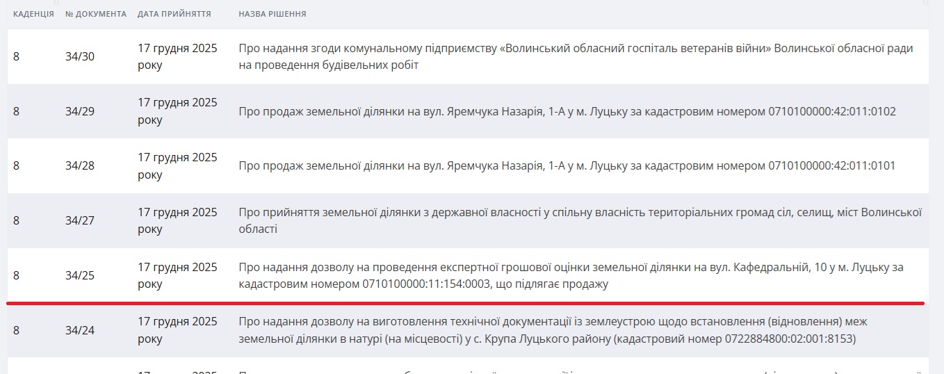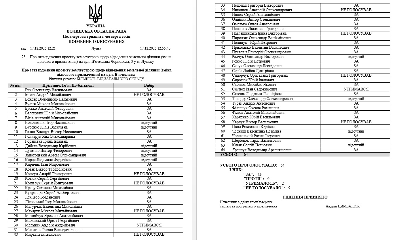 І ось 17 грудня 2025 року за 2 дні до скандальних обшуків відбувається сесія Волинської обласної ради. На неї таки виносять горезвісне рішення №25. «Про затвердження проекту землеустрою щодо відведення земельної ділянки (зміна цільового призначення) на вул. В'ячеслава Чорновола, 3 у м. Луцьку»