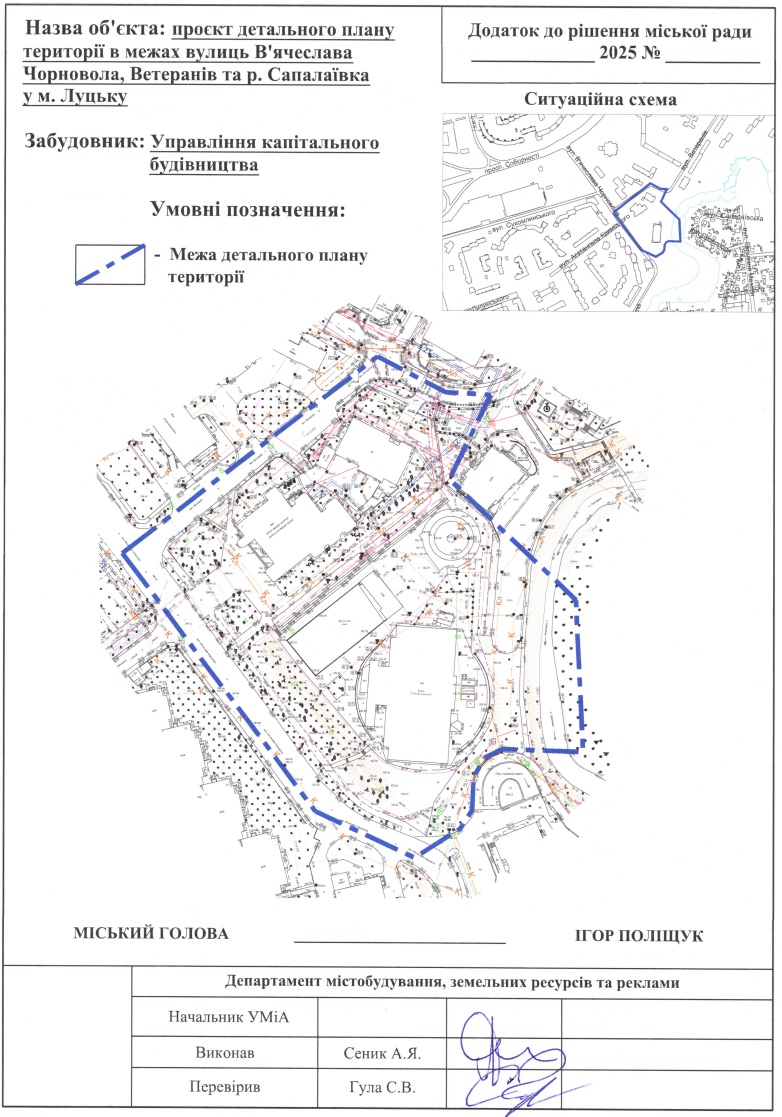 « «Про надання дозволу на розроблення проєкту детального плану території в межах вулиць В’ячеслава Чорновола, Ветеранів та р. Сапалаївка у м. Луцьку», враховуючи звернення громадянина Савчука Юрія Петровича».