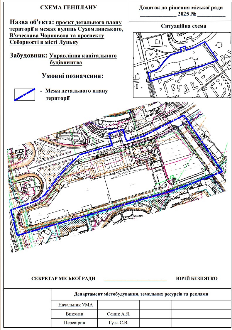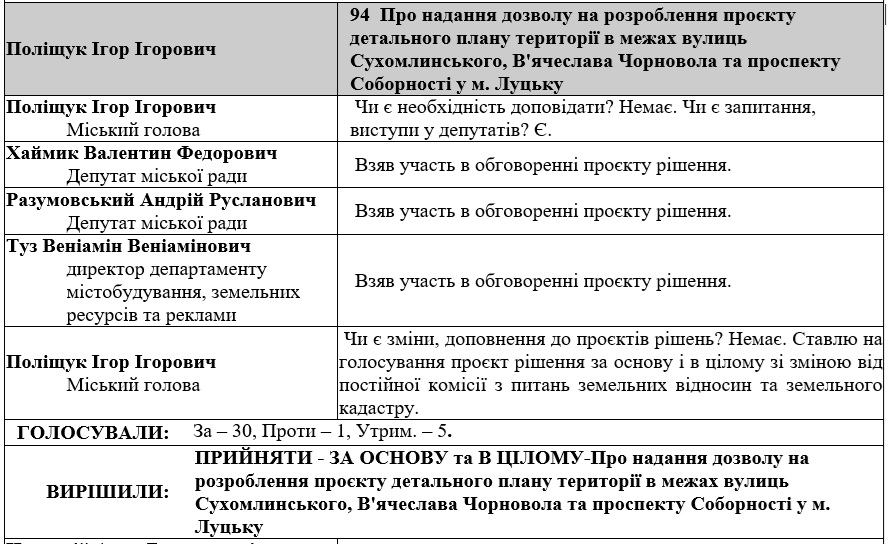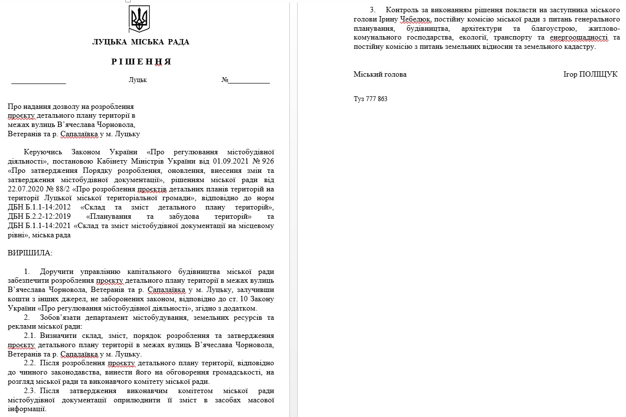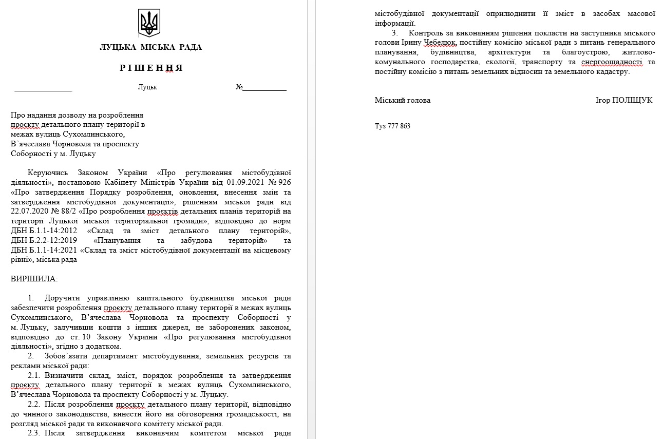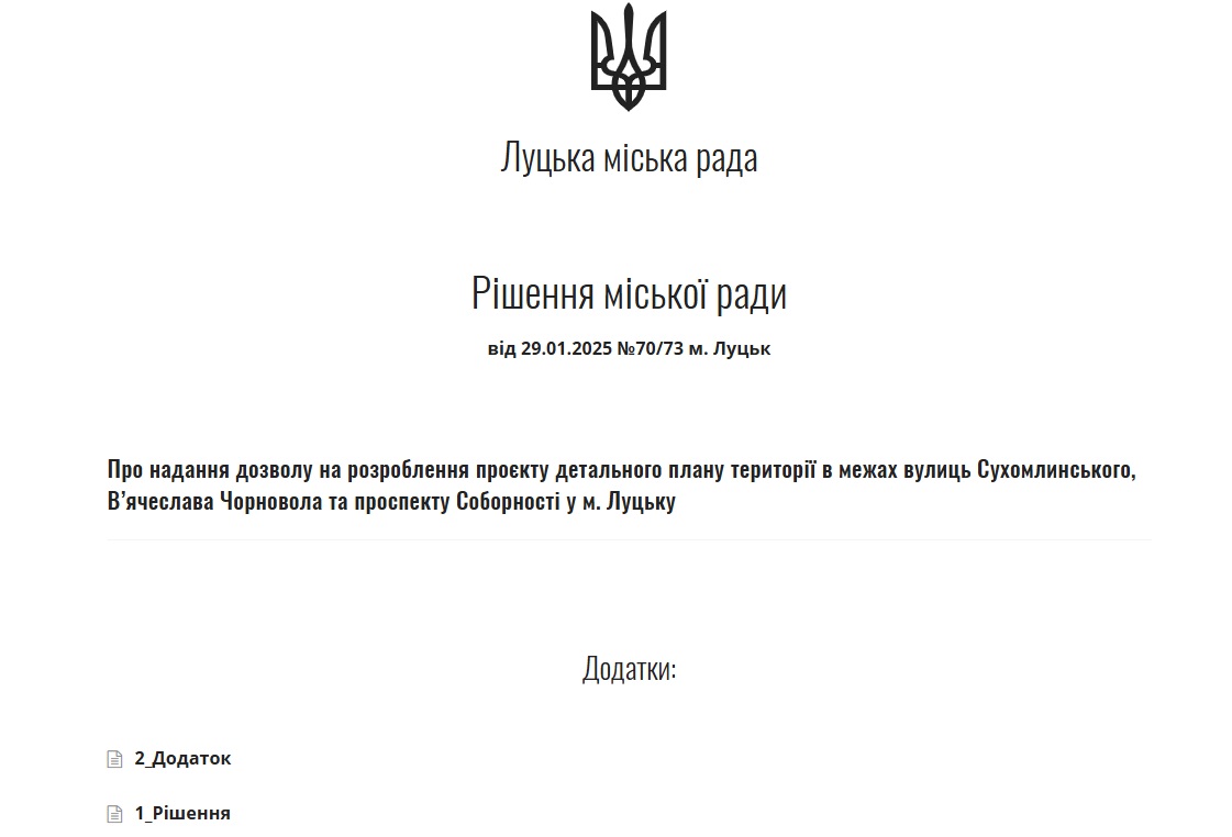 Однак, має абсолютно іншу назву: «Про надання дозволу на розроблення проєкту детального плану території в межах вулиць Сухомлинського, В’ячеслава Чорновола та проспекту Соборності у м. Луцьку».