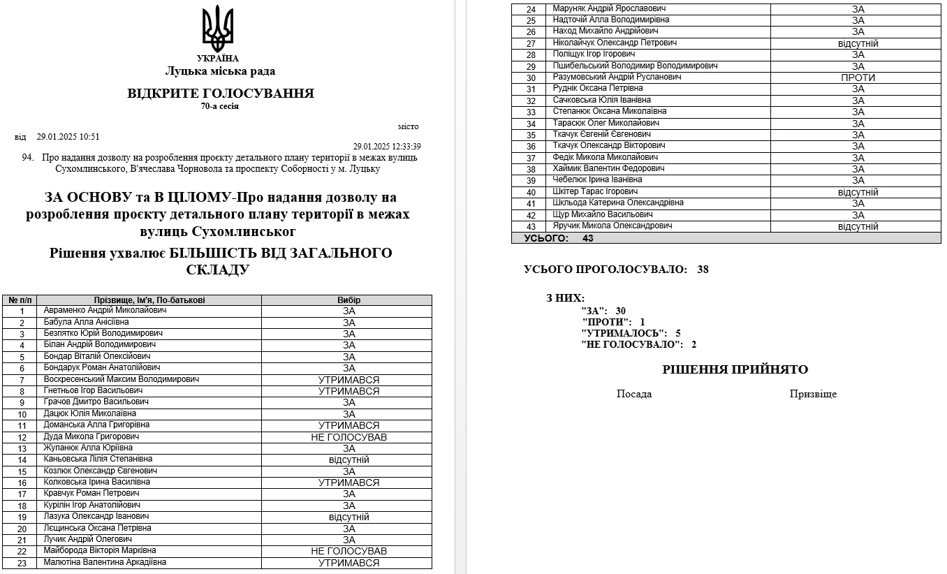 Попри те, що перелік прийнятих рішень навмисно або ненавмисно підчистили – нам вдалось відшукати протокол засідання. І дійсно – під час сесії депутати Волинської обласної ради таки голосували за зміну цільового призначення ділянки на вул. В'ячеслава Чорновола, 3, яке в переліку питань – під номером 25.
