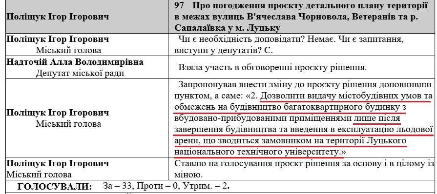«Вношу окремим пунктом: «Дозволити видачу містобудівних умов та обмежень на будівництво багатоквартирного будинку лише після завершення будівництва та введення в експлуатації льодової арени, що зводиться замовником на території ЛНТУ»», – заявив на початку розгляду рішення під час сесії Ігор Поліщук.