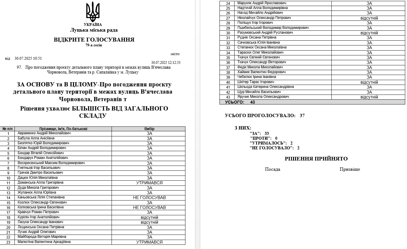 У такий спосіб, депутати Луцької міської ради погодили детальний план території в межах вулиць Чорновола, Ветеранів та річки Сапалаївка.